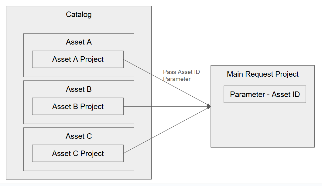 The only other solution I can currently think of is to keep your main approval workflow as is and create separate mini workflows, one for each Catalog Asset. These mini workflows do nothing but call the main workflow, passing an identifier for the specific Asset requested. Something like this: