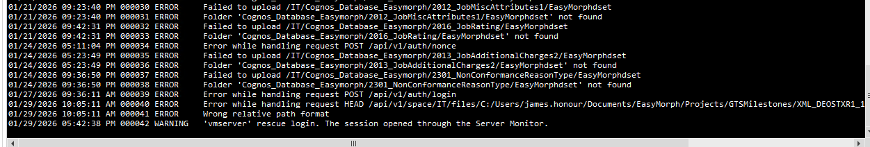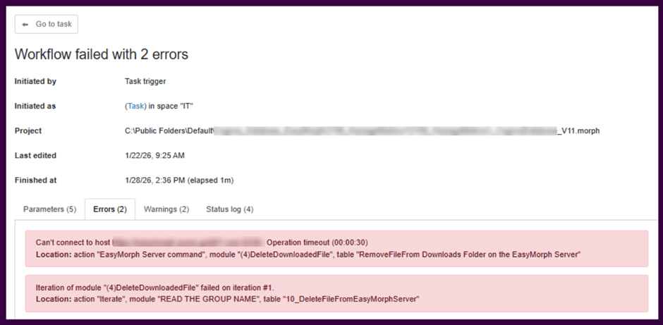 Regarding the load balancer: The issue here is that when the EasyMorph Server Command action calls the server through the load balancer URL, it creates a network loop: Server → Load Balancer → Server. Depending on the load balancer's configuration (timeouts, connection handling, keep-alive settings), this can introduce unintended side effects and intermittent connectivity failures. As a potential solution, consider either specifying localhost in the Server command`s connector settings, or adjusting your network routing so that the server can reach itself directly without passing through the load balancer.