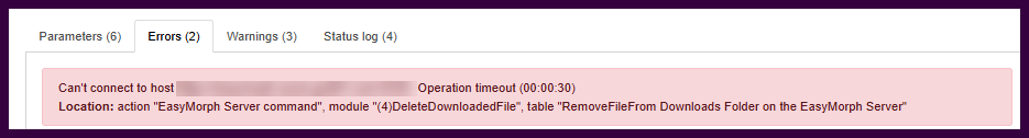 Regarding the error: This error indicates that the EasyMorph Server Command action responsible for executing the specified operation was unable to establish a connection to the server within the 30-second timeout period. The root cause could be related to either network connectivity issues or server overload (insufficient threads available to process incoming requests).