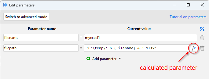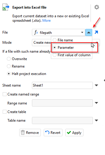 I have a parameter that is used to "select" the SQL db name I want to use, I would like to have the same name used to the Excel Export file name, but on a specific folder, not the project's folder.