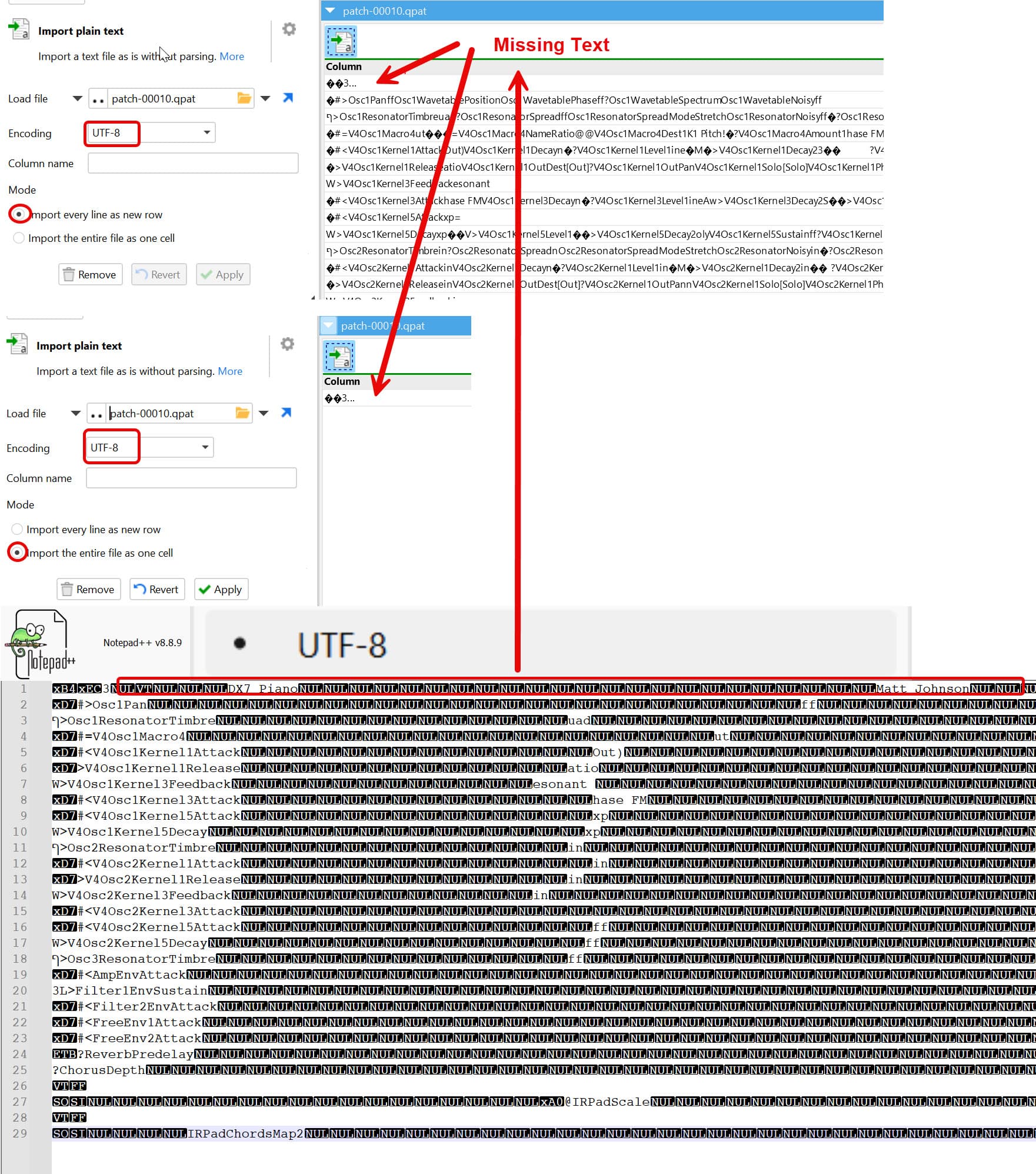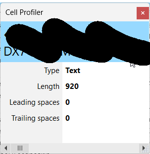 The text is imported, but it does not appear in the UI because it includes ASCII NUL (0x00) code points, which are not currently rendered. Checking the profiler shows that the cell length exceeds the visible character count.