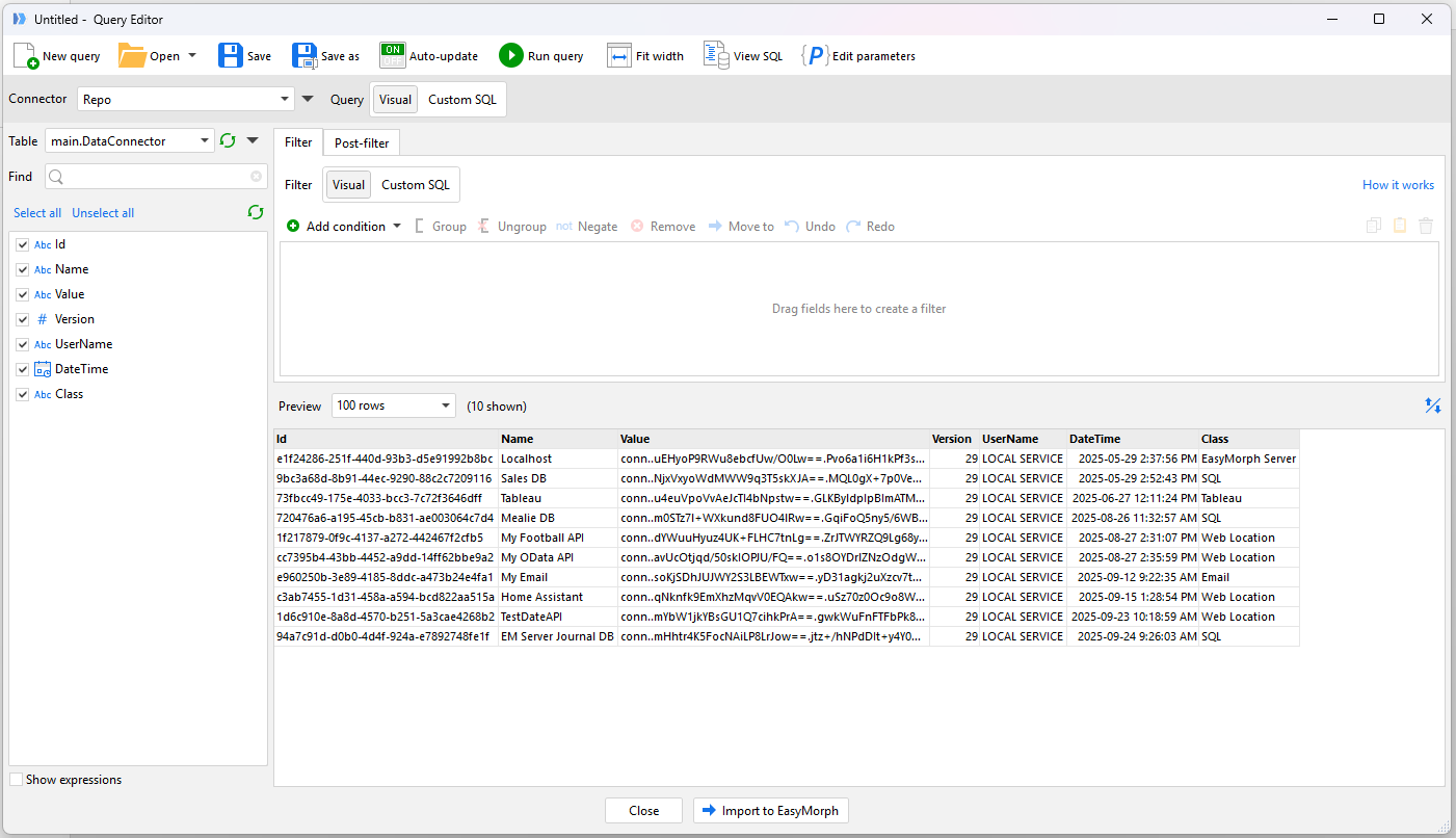 Seconding this! We also have a use case for being able to export the list of connectors in a Server Space out to an excel file or a database. Similar to the 'List of Files' or 'List of Tasks' command under the 'EasyMorph Server Command' action, I'd like to have a 'List of Connectors' to help us with governance and standardized naming conventions. Today, we need to manually review each space's connectors individually to implement governance. I wouldn't want all the details of a connector exported, probably just the Name, Type, & Note shown in the Connector Manager.