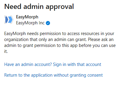 Have you tried to authorize the connector using the "Multi-factor authentication" mode and a Microsoft account from your Microsoft tenant? If that fails, please post (or send to support@easymorph.com) a screenshot of the error message.