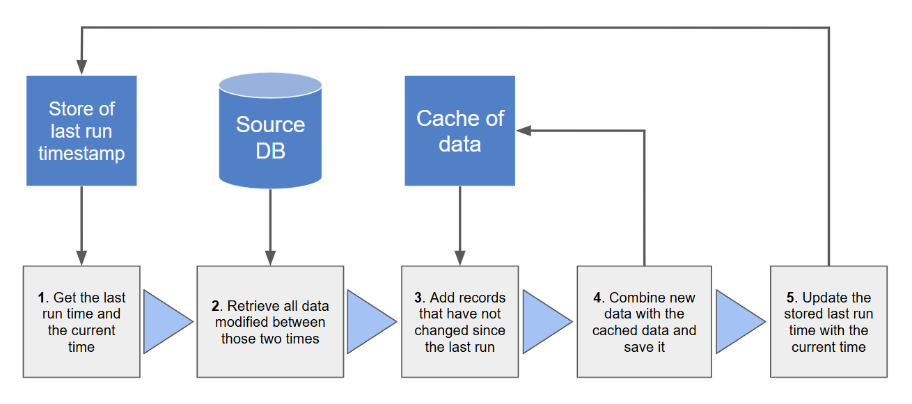 For now, let’s keep things simple and ignore complicating factors like handling deleted records or performing full reloads periodically to ensure accuracy. The simple steps we need to perform each time to incrementally load the data are as follows:
