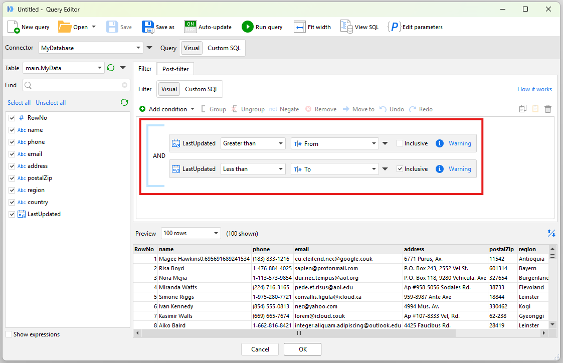 An important point to note is that the “Inclusive” options which make the SQL where clause “Greater than From and less than or equal to To”. This is so easy to miss and can be one factor in incremental data sets diverging from the source over time. If we don’t have the “or equal to” on one of the filters and a record is modified on the exact second that we use as our From or To then it will never be loaded.