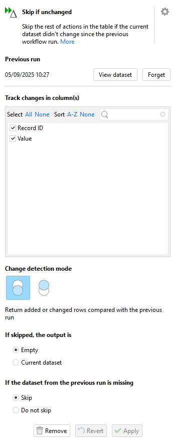The action has 2 main “Change detection modes”. The first detects if any new or modified records exist and outputs only those rows to the next action. As I’m sure you can see, this functionality is very similar to part of the process we looked at in the first example above. And so we could substitute the corresponding part for this new action.
