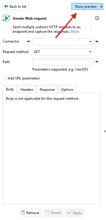 NB: it would be great if the “show preview” of iterate web request would work like the preview of the new “iterate”, where you can choose the record to be processed