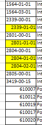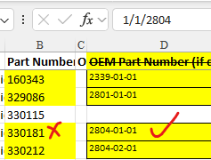 If you open the Excel file you’ll see that the P/N column is all set to left-align. This is making it look like they are all text, hiding the real data types. If you turn left-align off you will see that they align left or right dependant on the data type (text or numeric) and the one’s you highlighted in yellow are aligning right indicating they are numeric in the Excel data.