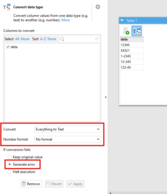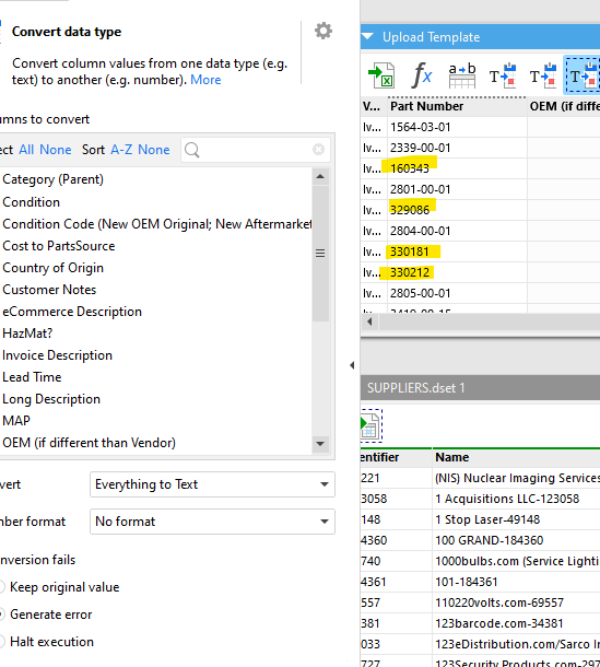 I have a file provided in XLS. The Convert Data Type function does not seem to work properly for a small subset of items that are being incorrectly transformed. I’ve tried to convert to both Text and Number, but the values are not properly displaying. Any suggestions?
