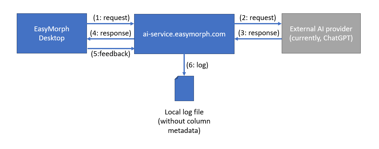 - Do you have any schema that can help to understand how it works. Even a simple diagram with your AI Service and one Easymorph desktop. If the data passed to the service is stored, can you mention it ? Where is it stored ? Do you use any solution in the cloud under the hood ? OpenAI ? Do you have any documentation that can help to understand, from an security expert perspective ?