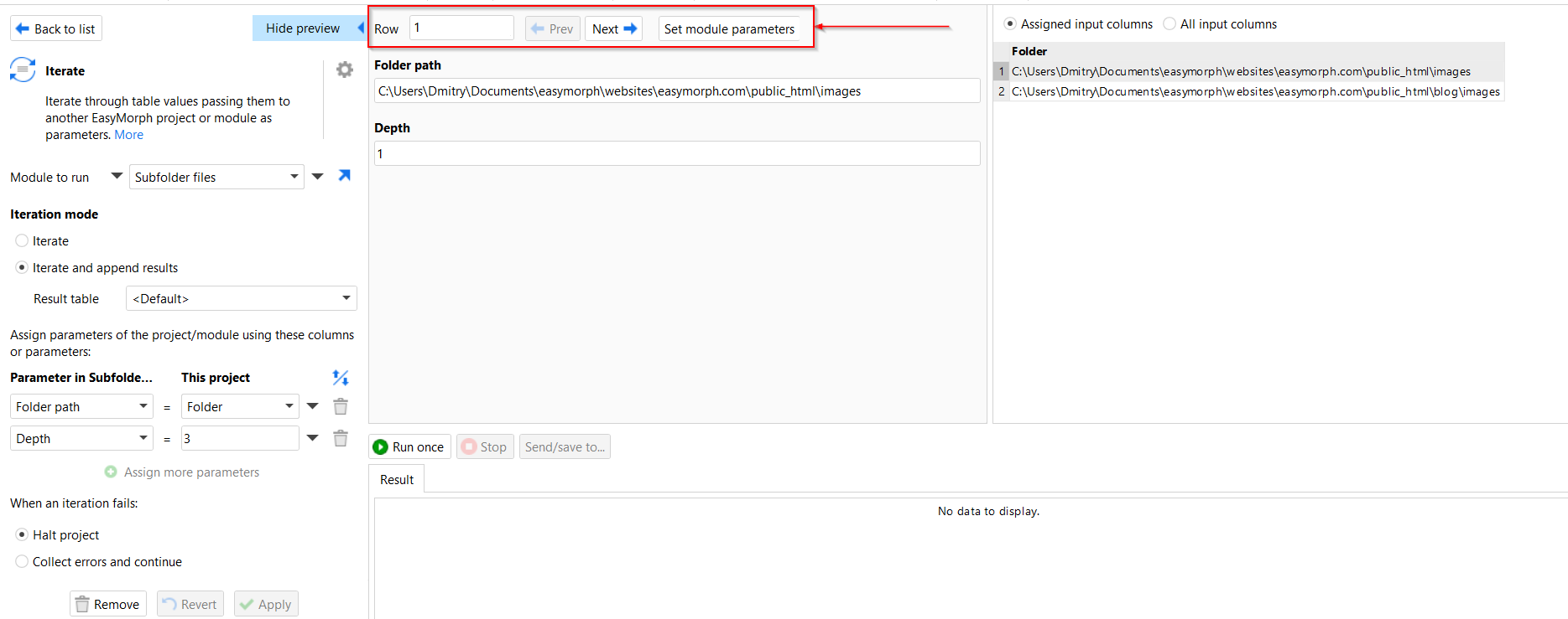 while using module I found an opportunity for a good feature: when you call a module, you set the parameters and then, in the module, you've to configure the parameters again with some value. It would be great if it'll be possibile to set these parameters from the main module, on the iteration action.