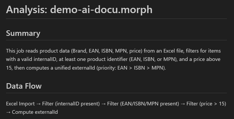 Currently, for example, I use it for documenting more complex jobs. I often have various filters on a dataset – sometimes with calculated intermediate fields and extra queries to check if it's empty, etc. AI can then easily summarize this into a business logic that even non-IT professionals can understand.