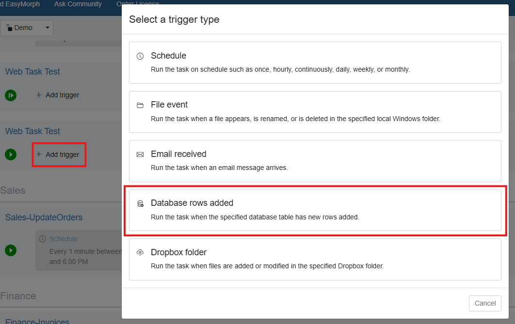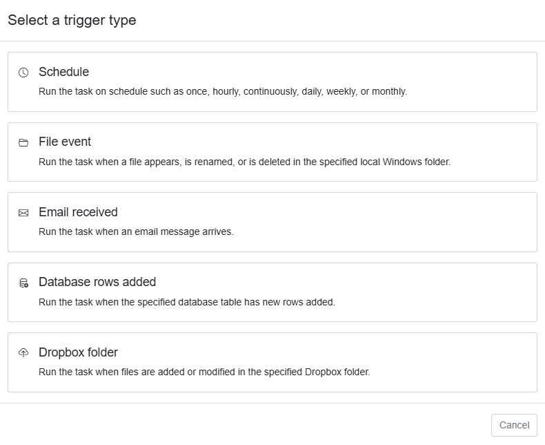 Thankfully, as well as schedule triggers, EasyMorph Server tasks can have event based triggers also. There are more triggers planned for future versions, but at the time of writing, the following trigger types are supported: