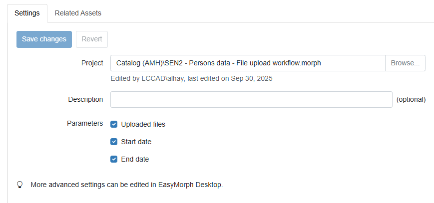 With the “File Upload” parameter type in version 5.9, EasyMorph Server also prompts me to upload the file when I run the project as a task. EasyMorph Server handles storing the file including checking it for viruses and other security risks.